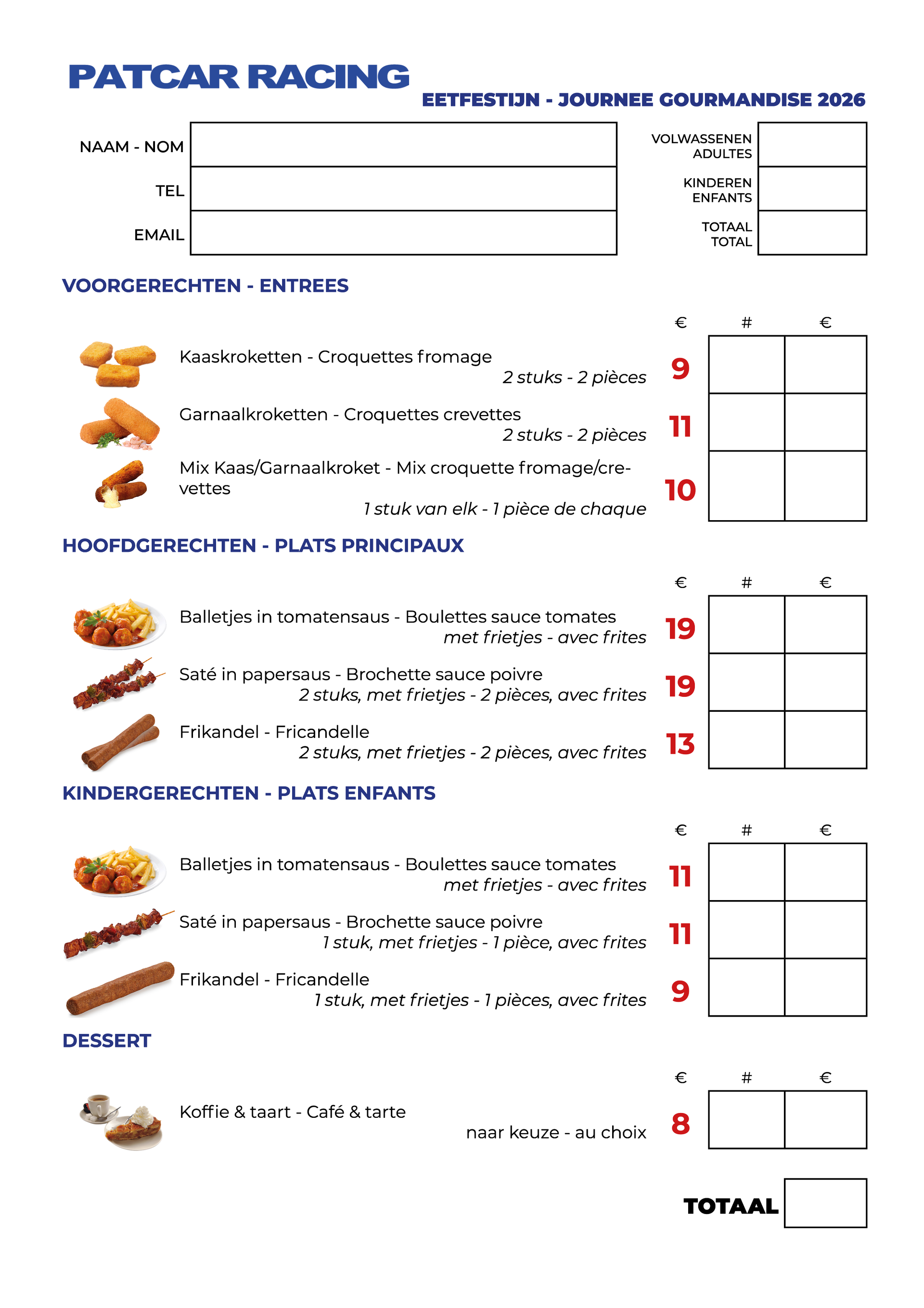 Bekijk alvast hieronder wat er zoal te smaken valt, stuur ons een mailtje met je bestelling: aantal aanwezigen (opgesplitst in kinderen en volwassenen), aantal van elk gerecht, tijdstip waarop wij je mogen verwachten en je plaatsje(s) za/zullen gereserveerd zijn.